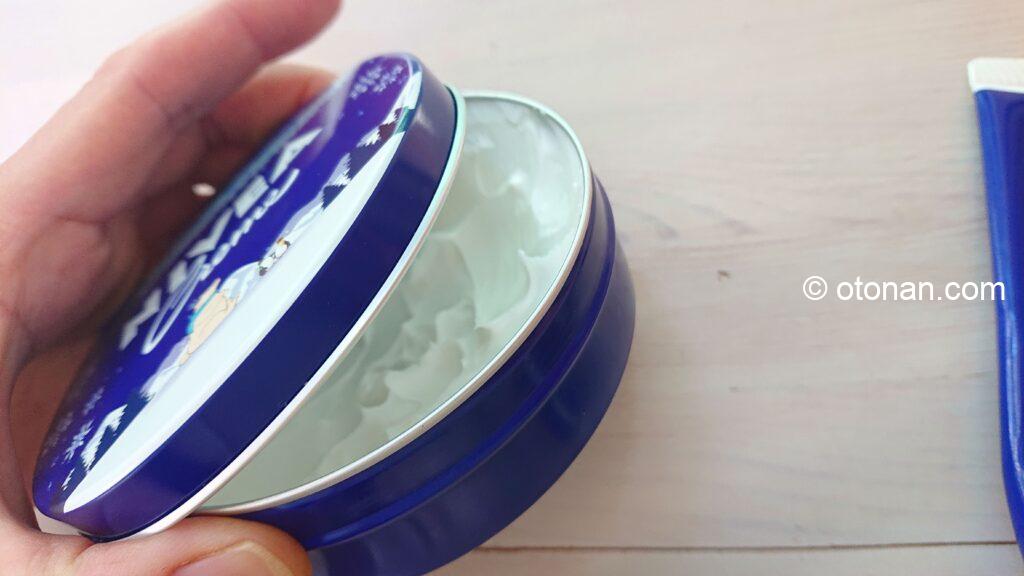 安価・伸ばしやすて適度に潤う・青缶は片手でフタが取れる構造・置いている店が多いといったメリットがあります。顔につける時は手にとって伸ばし、ごく少量から試すのが良さそうです。